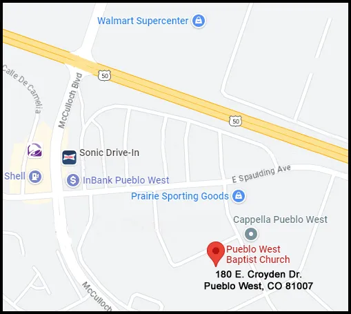 Pueblo West Baptist Church is the host church. The church building is located at 180 East Croyden Drive in Pueblo West.